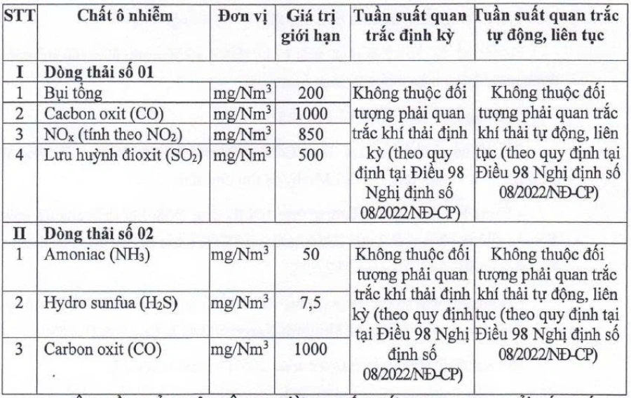 Khí thải phát sinh từ các bể xử lý nước thải được xử lý bằng thác lọc than hoạt tính và khí thải từ máy phát đạt Quy chuẩn kỹ thuật quốc gia về khí thải công nghiệp đối với bụi và các chất vô cơ (QCVN 19:2009/BTNMT).