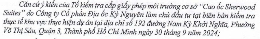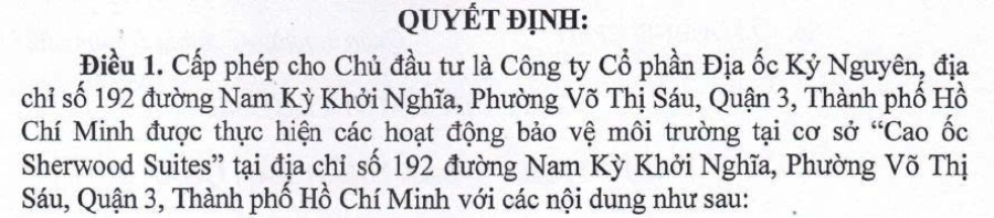 Dự án "Căn hộ cao cấp cho thuê kém hợp dịch vụ Cao Ốc Sherwood Suites" được xây và đi vào hoạt động từ năm 2016, sau nhiều năm hoạt động, xin và gia hạn giấy phép xả thải. Theo Nghị Định mới 08/2022/NĐ-CP ngày 10/01/2022 của Chính Phủ về qui định chi tiết một số điều trong luật bảo vệ môi trường, Chủ Doanh Nghiệp dự án đã tiến hành thực hiện xin cấp giấy phép môi trường
